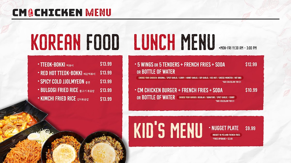 Welcome to CM Chicken Schaumburg, a true gem specializing in Korean fried chicken that has quickly become a favorite among both locals and visitors. Nestled at 1602 E Algonquin Rd, Schaumburg, IL, this inviting spot is celebrated for its exceptional quality and mouthwatering flavors.
